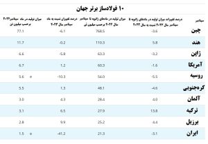 آخرین گزارش انجمن جهانی فولاد نشان می‌دهد بیشترین افزایش ۹ ماهه نخست امسال نسبت به همین مدت در سال ۲۰۲۳ مربوط به سه کشور ترکیه، هند و برزیل است که به ترتیب رشد ۱۳.۸، ۵.۸ و ۴.۴ درصدی را تجربه کردند و در رتبه‌ بعدی آلمان با ۴.۰ درصد افزایش تولید قرار دارند.
