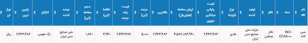 بورس کالا به قیمت پایه 2,463,486 ریال توسط شرکت ملی صنایع مس ایران عرضه